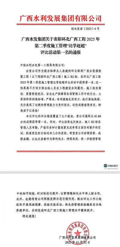 11月13日,从业主单位传来喜讯,在2025年第二季度施工管理“比学赶超”评比中,由水电一局承建的广西环北部湾水资源配置工程B2标段,从全线四个片区、15个标段中脱颖而出,以总分第一的成绩拔得头筹。 自今年5月业主单位启动“比学赶超”专项活动以来,水电一局广西环北项目部高度重视、迅速响应,将评比作为基础管理提升、锤炼干部队伍的重要契机,系统部署、全面推进各项准备工作。围绕评比涵盖的质量管理、安全生产、文明施工等9大方面、62项具体内容,全面开展自查自纠与整改提升。通过提前谋划、对标梳理,将典型经验固化为管理标准,把问题整改融入日常管控,切实推动“比学赶超”从活动要求转化为常态化管理机制,有效促进了项目整体管理水平的持续提升。 经过系统整治与持续优化,B2标段项目现场规范的施工组织、严格的工序控制、统一的安全标准以及高效的网格化管理,获得各方一致好评。7月18日,业主专门在B2标段现场组织举办环北广西工程“质量安全年”主题活动暨“比学赶超”现场观摩交流,来自业主单位、勘察设计、第三方超前预报、施工监理、设计监理及全线11个标段主体施工单位,共计100余人齐聚B2标段现场,围绕项目建设管理经验展开深入交流与学习。 此次荣获第一名,既是对阶段工作的肯定,更是新征程的起点。水电一局广西环北项目部将以此为契机,戒骄戒躁,持续保持昂扬斗志,严把工程质量关,守牢安全生产底线,在冲刺四季度、决胜全年度的建设浪潮中勇立潮头、争当标杆,全力实现年度各项任务目标,为公司高质量发展再立新功。 |