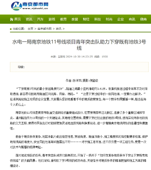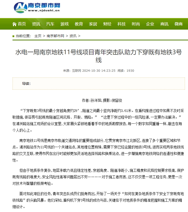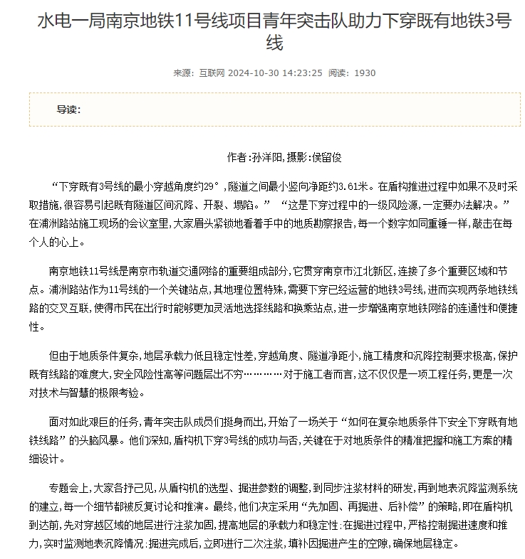 “下穿既有3号线的最小穿越角度约29°,隧道之间最小竖向净距约3.61米。在盾构推进过程中如果不及时采取措施,很容易引起既有隧道区间沉降、开裂、塌陷。” “这是下穿过程中的一级风险源,一定要办法解决。”在浦洲路站施工现场的会议室里,大家眉头紧锁地看着手中的地质勘察报告,每一个数字如同重锤一样,敲击在每个人的心上。 南京地铁11号线是南京市轨道交通网络的重要组成部分,它贯穿南京市江北新区,连接了多个重要区域和节点。浦洲路站作为11号线的一个关键站点,其地理位置特殊,需要下穿已经运营的地铁3号线,进而实现两条地铁线路的交叉互联,使得市民在出行时能够更加灵活地选择线路和换乘站点,进一步增强南京地铁网络的连通性和便捷性。 但由于地质条件复杂,地层承载力低且稳定性差,穿越角度、隧道净距小,施工精度和沉降控制要求极高,保护既有线路的难度大,安全风险性高等问题层出不穷…………对于施工者而言,这不仅仅是一项工程任务,更是一次对技术与智慧的极限考验。 面对如此艰巨的任务,青年突击队成员们挺身而出,开始了一场关于“如何在复杂地质条件下安全下穿既有地铁线路”的头脑风暴。他们深知,盾构机下穿3号线的成功与否,关键在于对地质条件的精准把握和施工方案的精细设计。 专题会上,大家各抒己见,从盾构机的选型、掘进参数的调整,到同步注浆材料的研发,再到地表沉降监测系统的建立,每一个细节都被反复讨论和推演。最终,他们决定采用“先加固、再掘进、后补偿”的策略,即在盾构机到达前,先对穿越区域的地层进行注浆加固,提高地层的承载力和稳定性;在掘进过程中,严格控制掘进速度和推力,实时监测地表沉降情况;掘进完成后,立即进行二次注浆,填补因掘进产生的空隙,确保地层稳定。 方案确定后,青年突击队迅速投入实战,深入施工一线,与工人们紧密合作,共同探索方案的可行性。通过实地考察、数据分析、专家咨询等多种方式,不断优化施工方案。他们密切关注每一个细节,创新性地提出了特殊管片设计、克泥效工法控制,建立信息化施工管理等举措,共同攻克了一个又一个安全技术难题,为浦洲路站即将的下穿工作奠定了坚实的基础。 在南京地铁11号线项目建设的过程中,青年突击队正以他们的实际行动,生动诠释了“请党放心,强国有我”的青春誓言。他们不仅展现了新时代青年的责任与担当,更用实际行动证明了青年一代是敢于拼搏、勇于创新的生力军。青年突击队的每一份付出、每一次突破,都为项目建设的稳步推进注入了源源不断的动力,也为祖国的繁荣富强贡献了自己的青春力量。 |